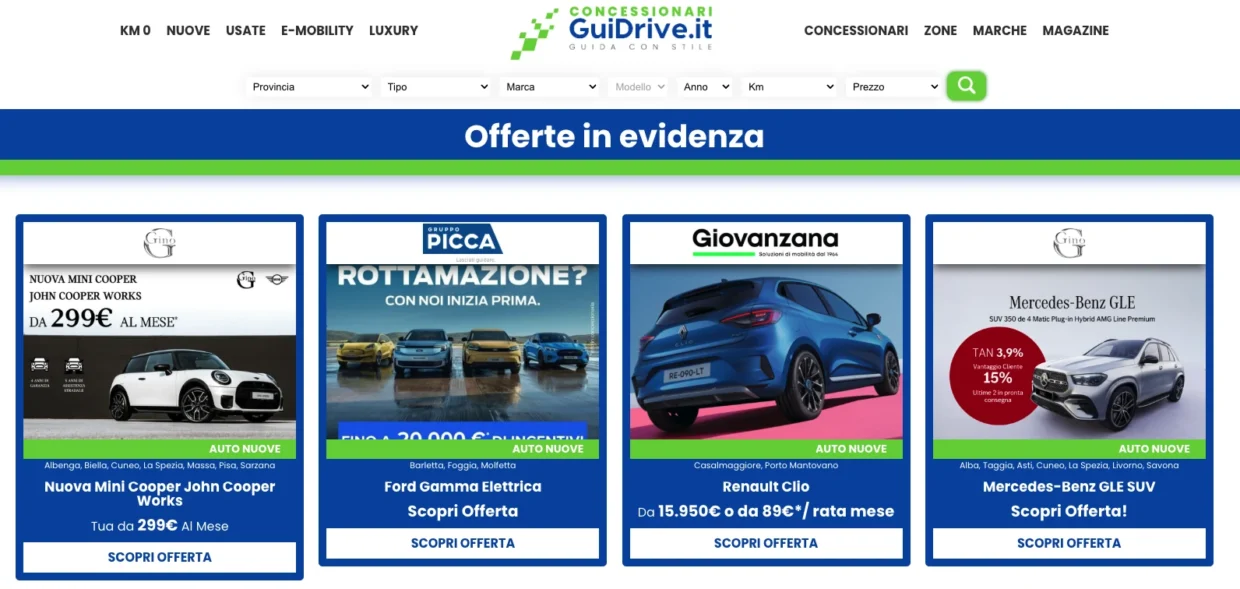 Con 250.000 utenti unici mensili e un tasso di conversione del 4-5%, Concessionari.Guidrive.it è lo strumento ideale per generare lead di alta qualità. Il nostro call center interno qualifica ogni contatto, con la possibilità per i dealer di personalizzare gli script e ottimizzare le conversioni.