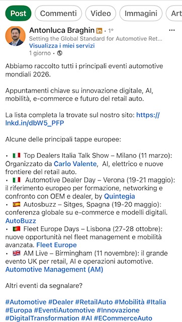Nel 2026 gli eventi automotive europei tornano ad essere il luogo dove si formano alleanze, si misurano i trend e si decidono investimenti su digitale, AI e nuovi modelli distributivi. Nella guida internazionale pubblicata da Phyron, tra le tappe più rilevanti del continente compaiono cinque appuntamenti “di riferimento” per dealer e OEM: dall’e-commerce ai servizi, dal fleet al retail. In questa shortlist entra anche l’Italia, con un evento che mette al centro la trasformazione del business in concessionaria e il dialogo tra dealer e innovazione.